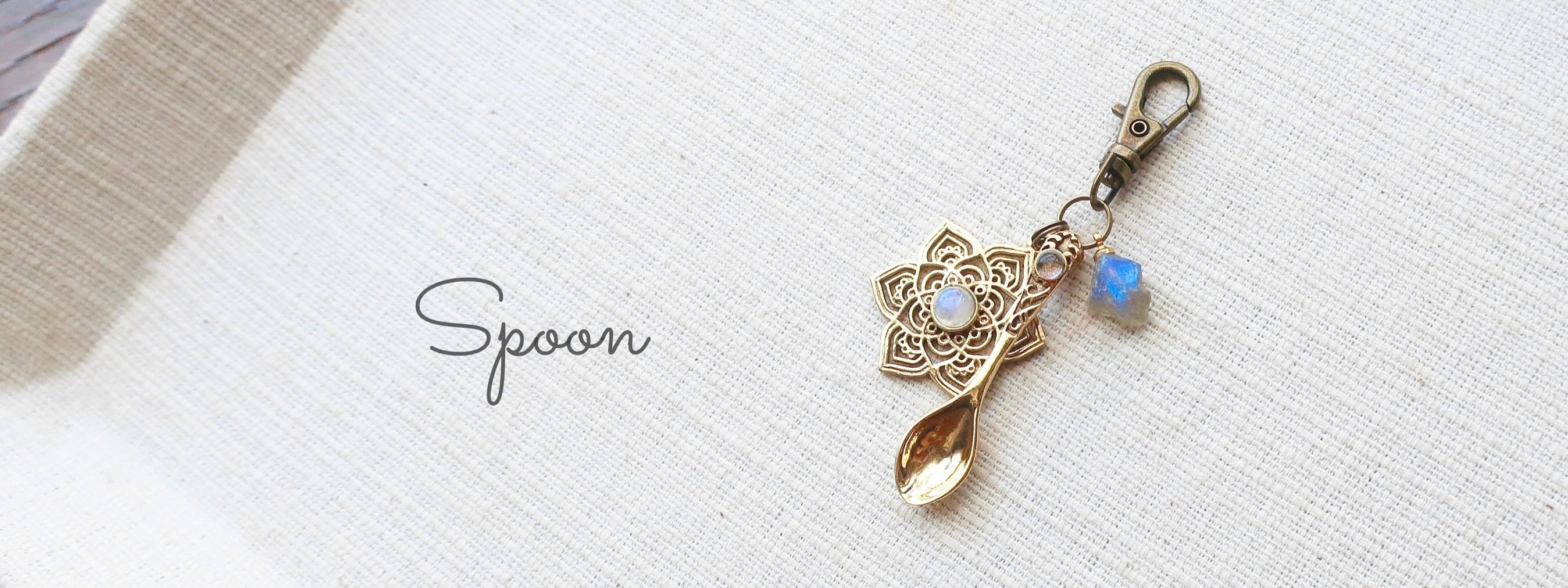 幸せを呼ぶHappy Spoon ✺ スプーンモチーフのキーホルダーです。 さりげないムーンストーンをあしらったスプーンのチャームに、グルグルチャームまたは幸せを呼ぶゾウさん、 そして特殊な加工を施したUSAガラスのビーズを組み合わせました。 爽やかなブルーのビーズがとてもきれいで、気分もすっきり明るくなります ✦✺.* 紐に通して、ネックレスとしてお使い頂くのもおすすめです♬ (画像のビーズ付きの紐は別売りになります) ✤ 素材 ✤ 真鍮 ムーンストーン ガラスビーズ ✤ サイズ ✤ 全長 7.7cm(ナスカン部分を含む) スプーン 縦4.2cm 無料でプレゼント用にラッピング出来ます。 ご希望の方は、ご注文時の備考欄にてお申し付けください。